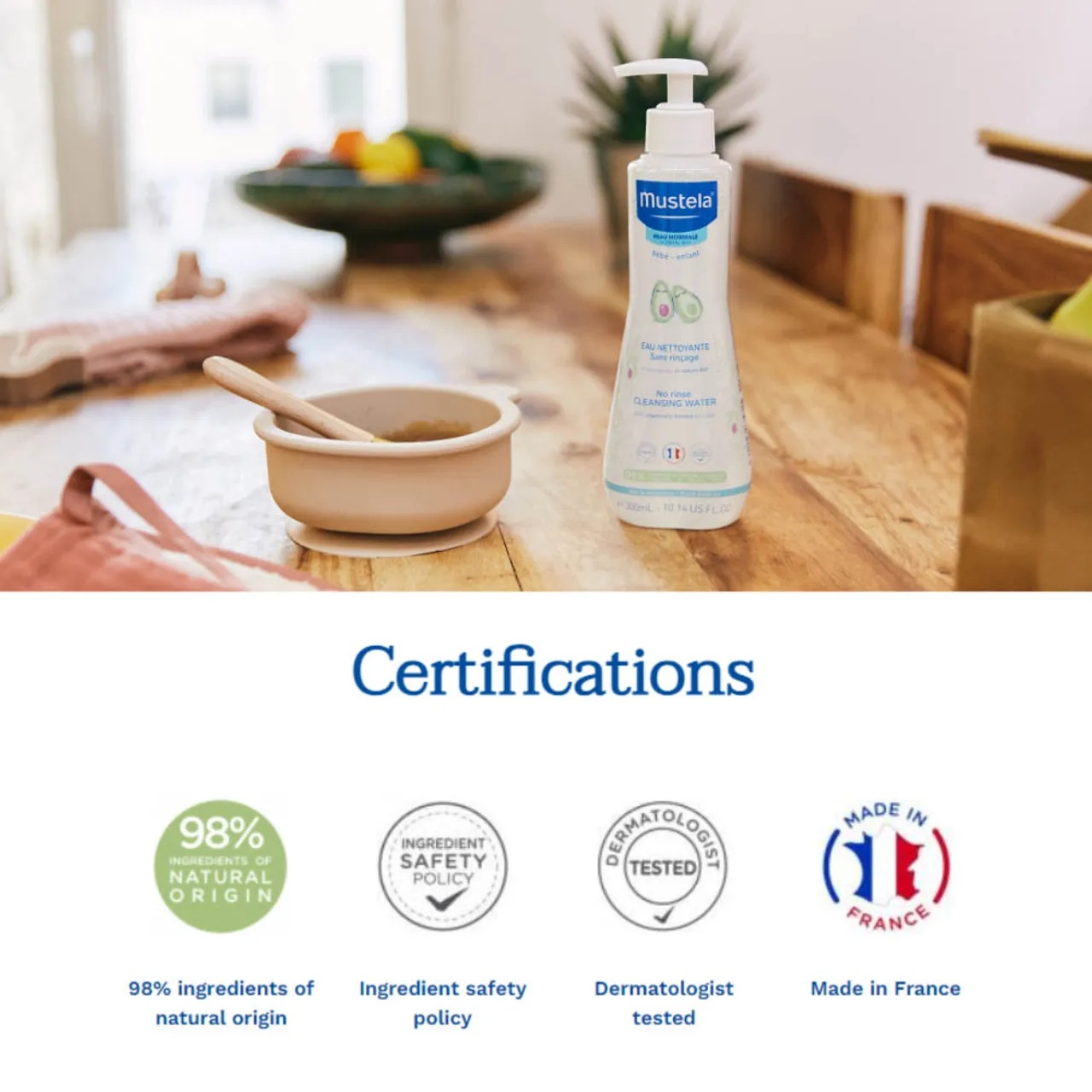 نظافة فورية وناعمة لبشرة طفلك مع ماء موستيلا المنظف بدون شطف.