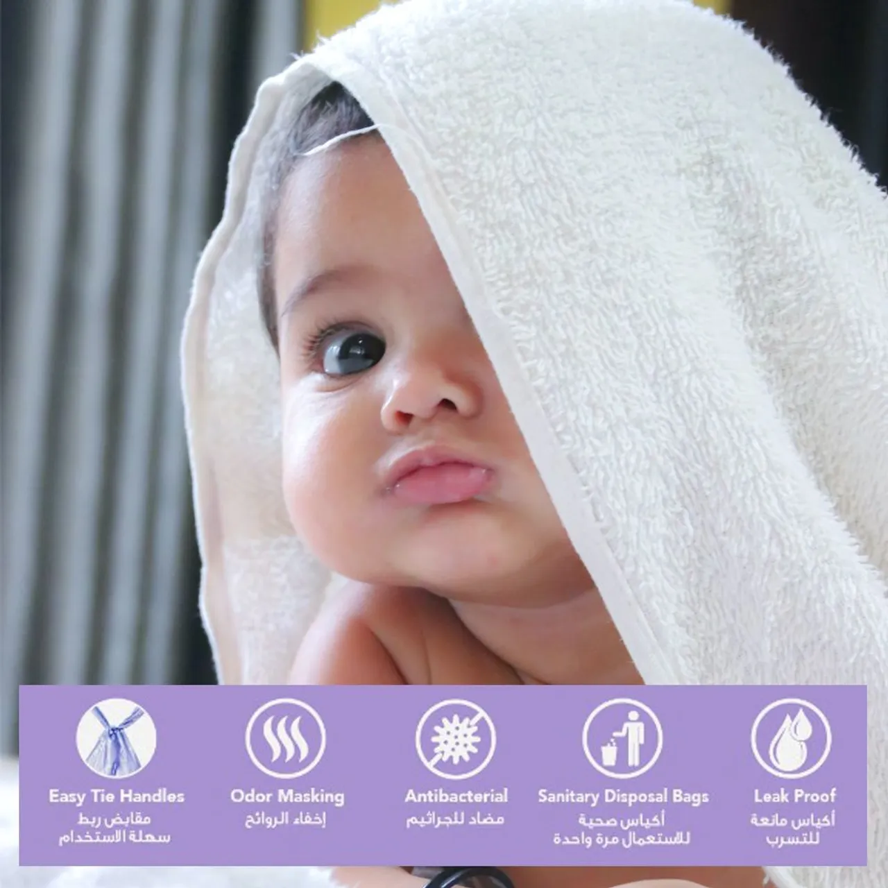 أكياس مخصصة للتخلص من الحفاضات بطريقة نظيفة وآمنة، تتميز برائحة منعشة وتساعد في حبس الروائح الكريهة، مما يجعلها مثالية للاستخدام اليومي سواء في المنزل أو أثناء التنقل